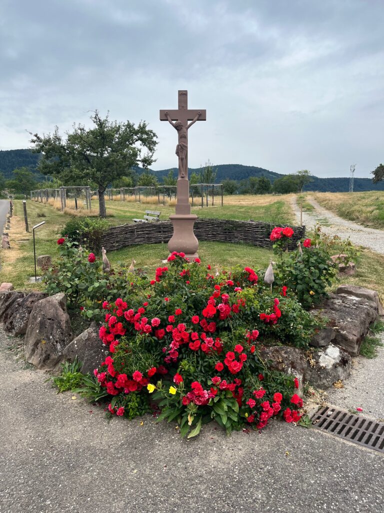 Après mûre réflexion, la décision a été prise collégialement de réimplanter le monument quelques mètres plus en arrière afin de le protéger de la circulation. C’est pourquoi, de nouvelles fondations ont dû être conçues pour assurer la portance du nouveau monument. L’opération a pu être menée à bien grâce à l’aide d’une entreprise locale, qui a apporté son soutien pour creuser la tranchée. La recherche de l’emplacement idéal nous a amenés, avec l’aide d’une amie bio géologue venue en voisine de Hengwiller, à constater que le calvaire était érigé sur une ligne de force revitalisante et bienfaisante, et que les anciens n’avaient pas choisi ce lieu « par hasard ». En reculant l’ensemble de quelques mètres, mais restant bien dans l’alignement de cette ligne d’énergie, le calvaire nouveau a été réinstallé le 13 Novembre 2021 !