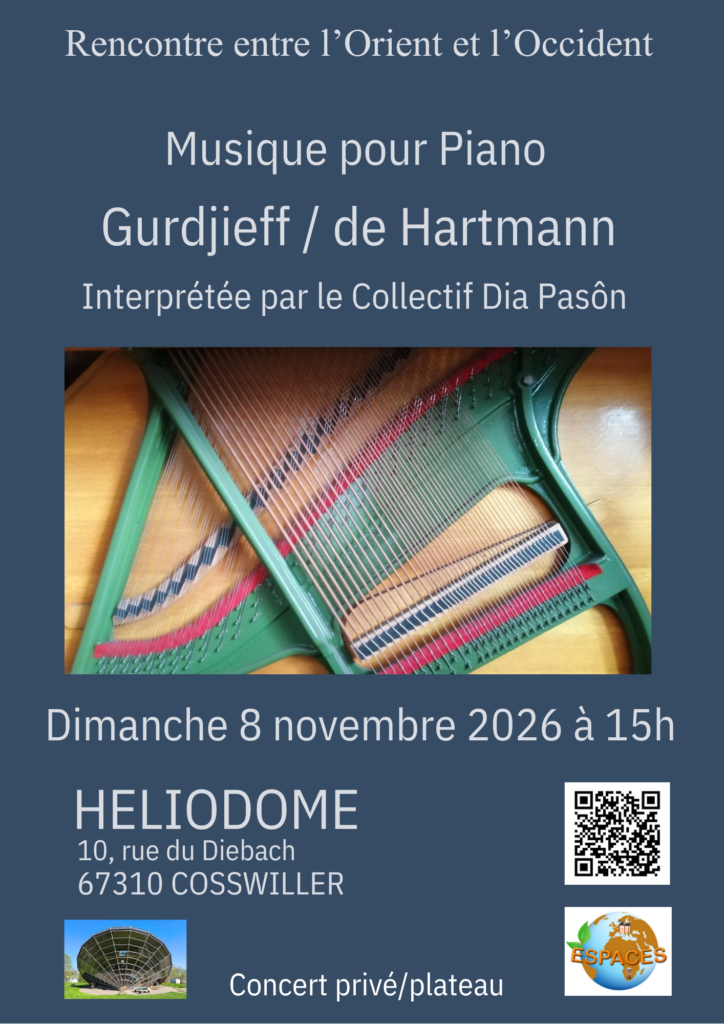 Fruit d’une intense collaboration entre G.I. Gurdjieff (1866-1949) et Th. De Hartmann (1885-1956) la musique proposée par le collectif Dia Pasôn comprend des pièces comme : Chants populaires, danses derviches, hymnes, prières et rituels.